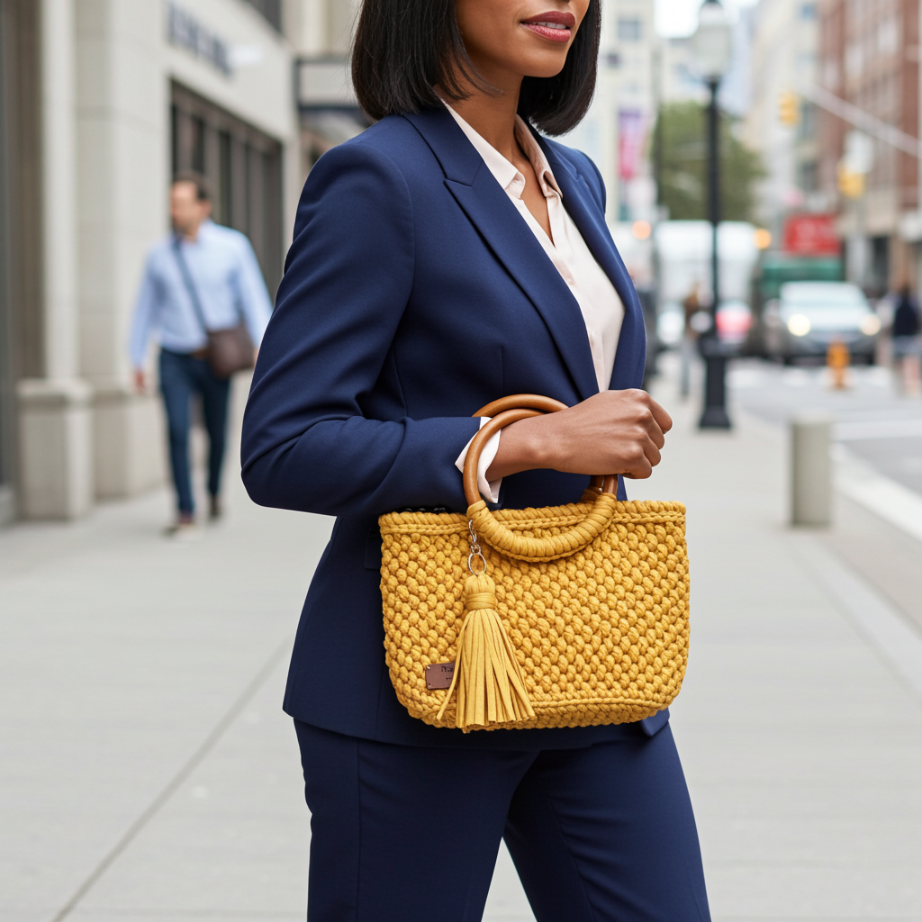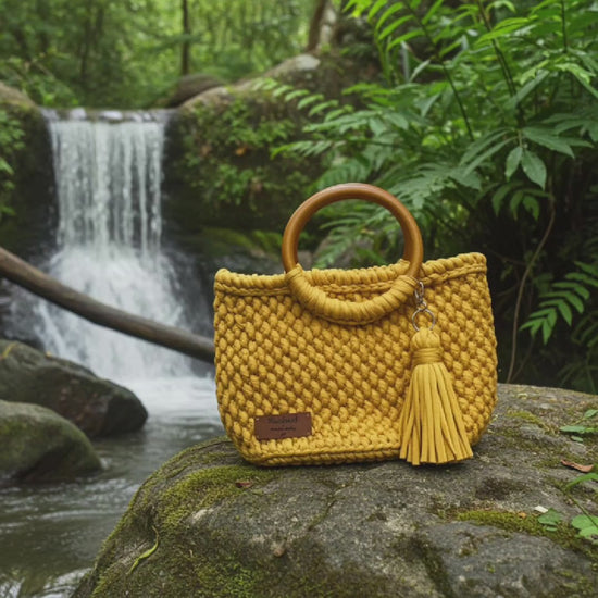 - **Timeless Design Details**: Features sturdy wooden hoop handles for comfortable carrying, a playful knotted tassel charm that sways with every step, and a subtle snap closure for secure storage. The interior boasts a clean white lining to keep your essentials protected.