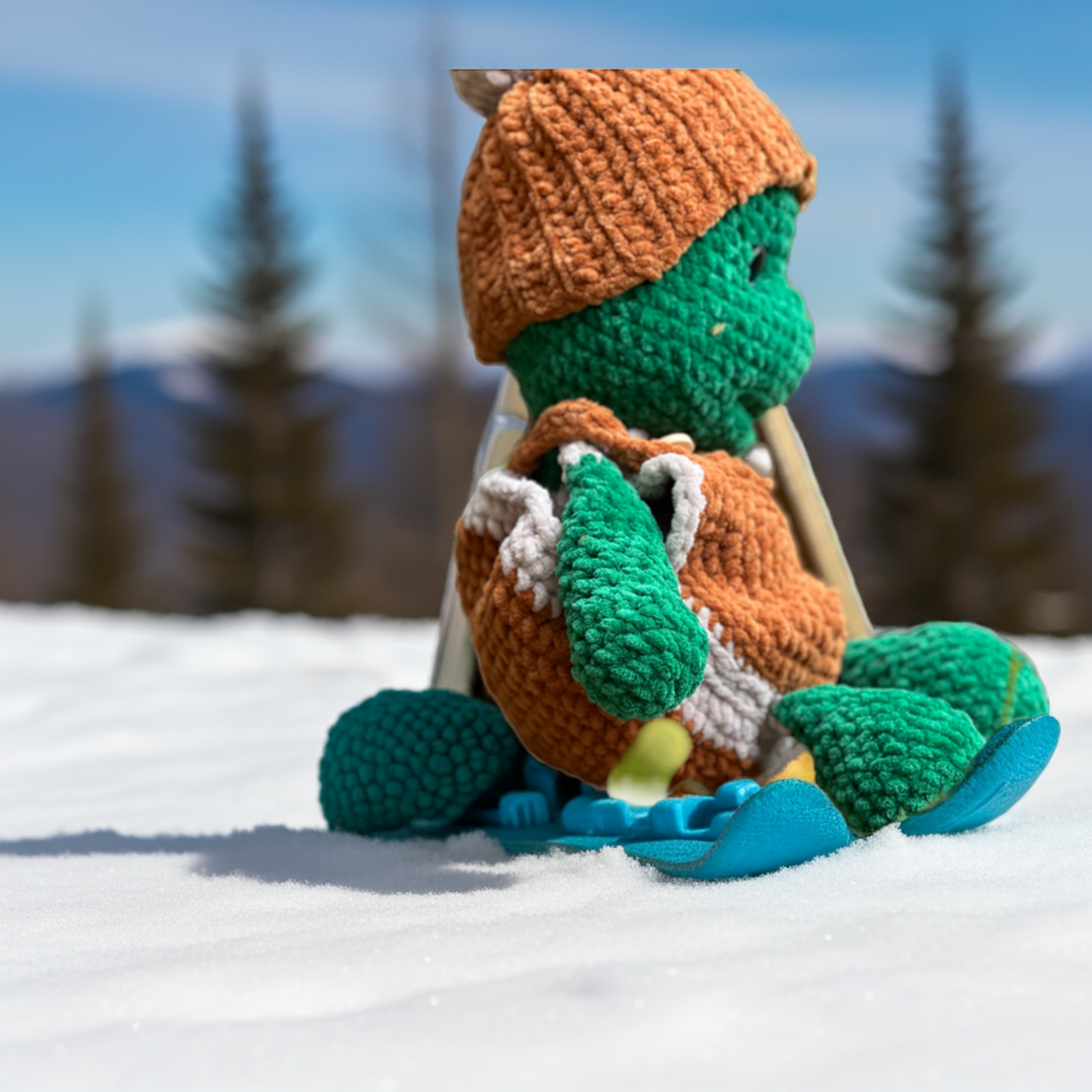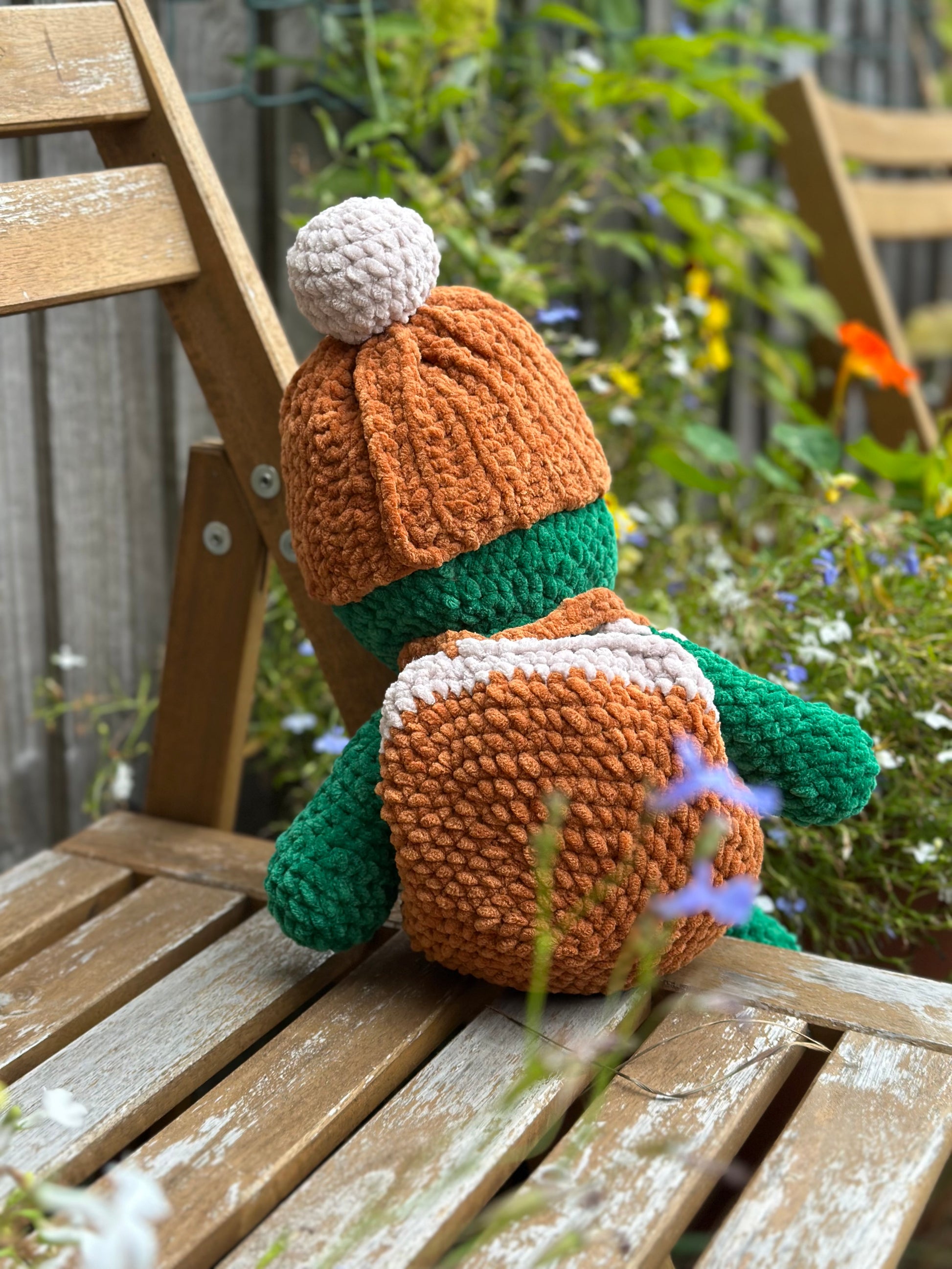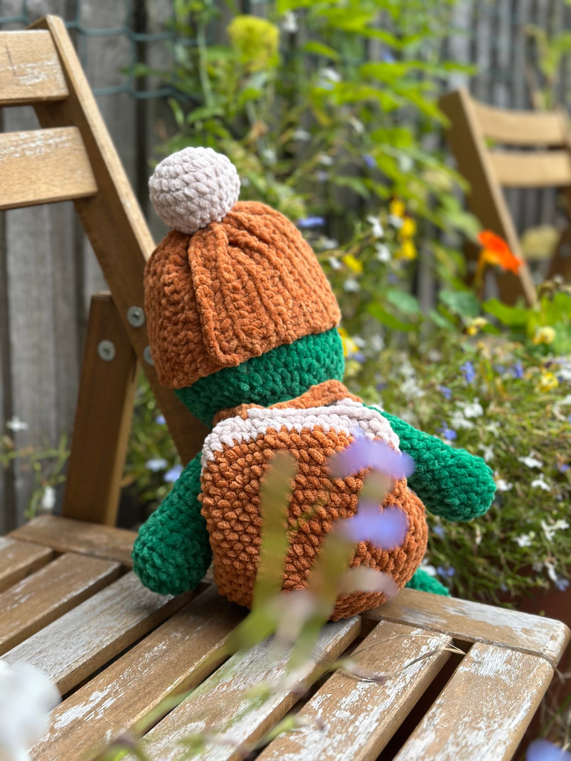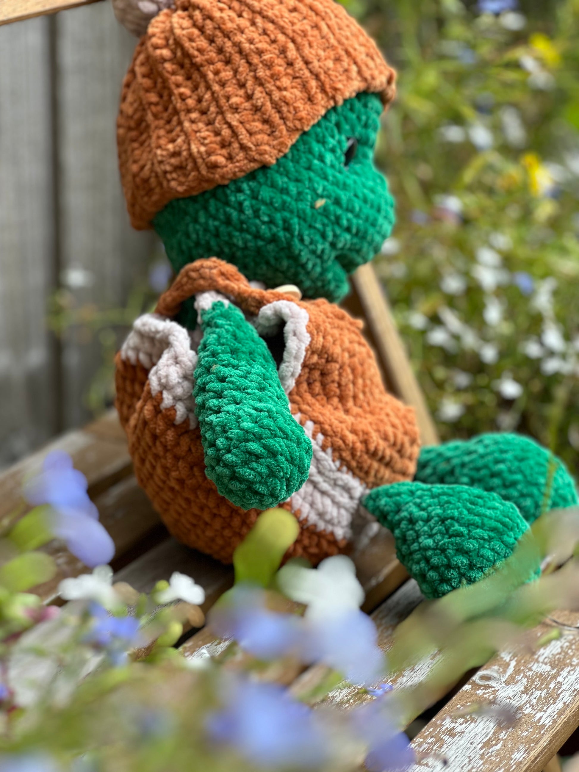 Meet Pacific Ridley Junior, a charming hand-crocheted turtle crafted from soft green chenille wool. This adorable creation features turtle shell dungarees in brown and beige with a button fastening, adding a touch of rustic charm. Complete with a removable beanie hat topped with a pom-pom, this cuddly companion is both stylish and customizable. Measuring approximately 34cm in length, 18cm in width, and 14cm in depth, each piece is lovingly made to order, ensuring unique variations in size. Perfect for gifting or adding a cozy touch to any space!