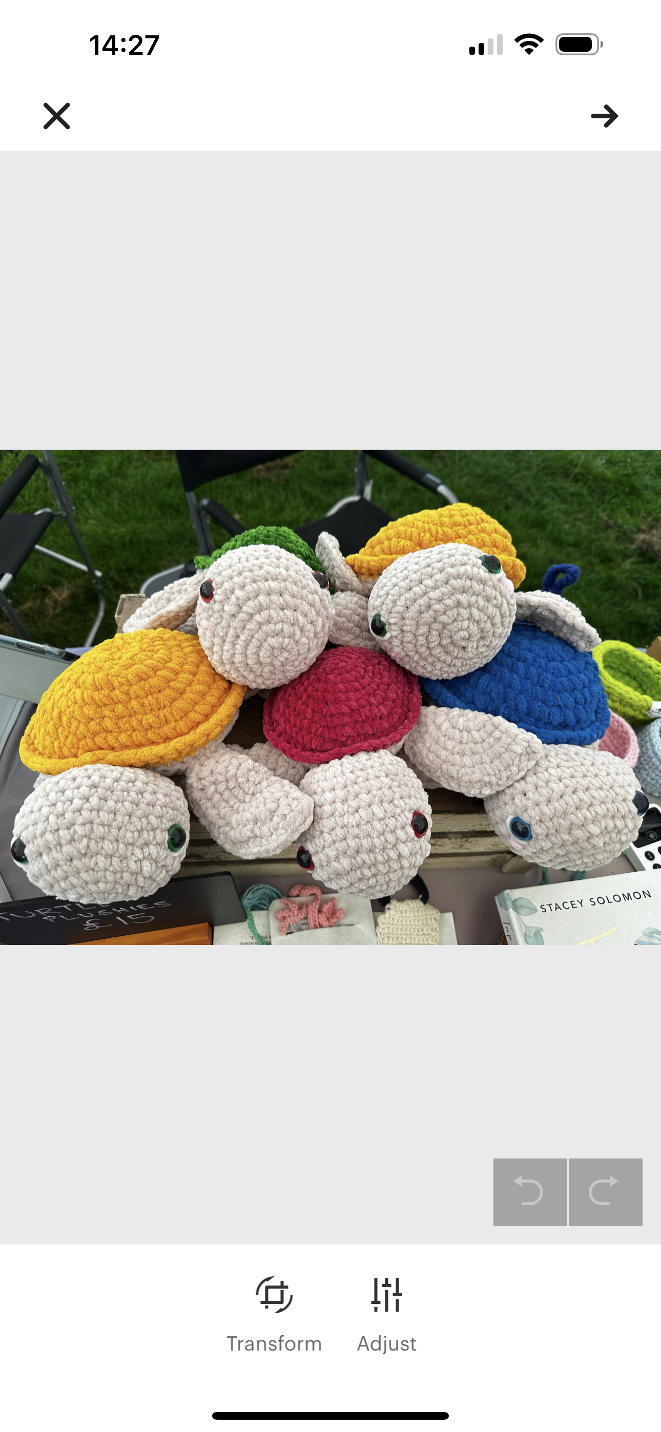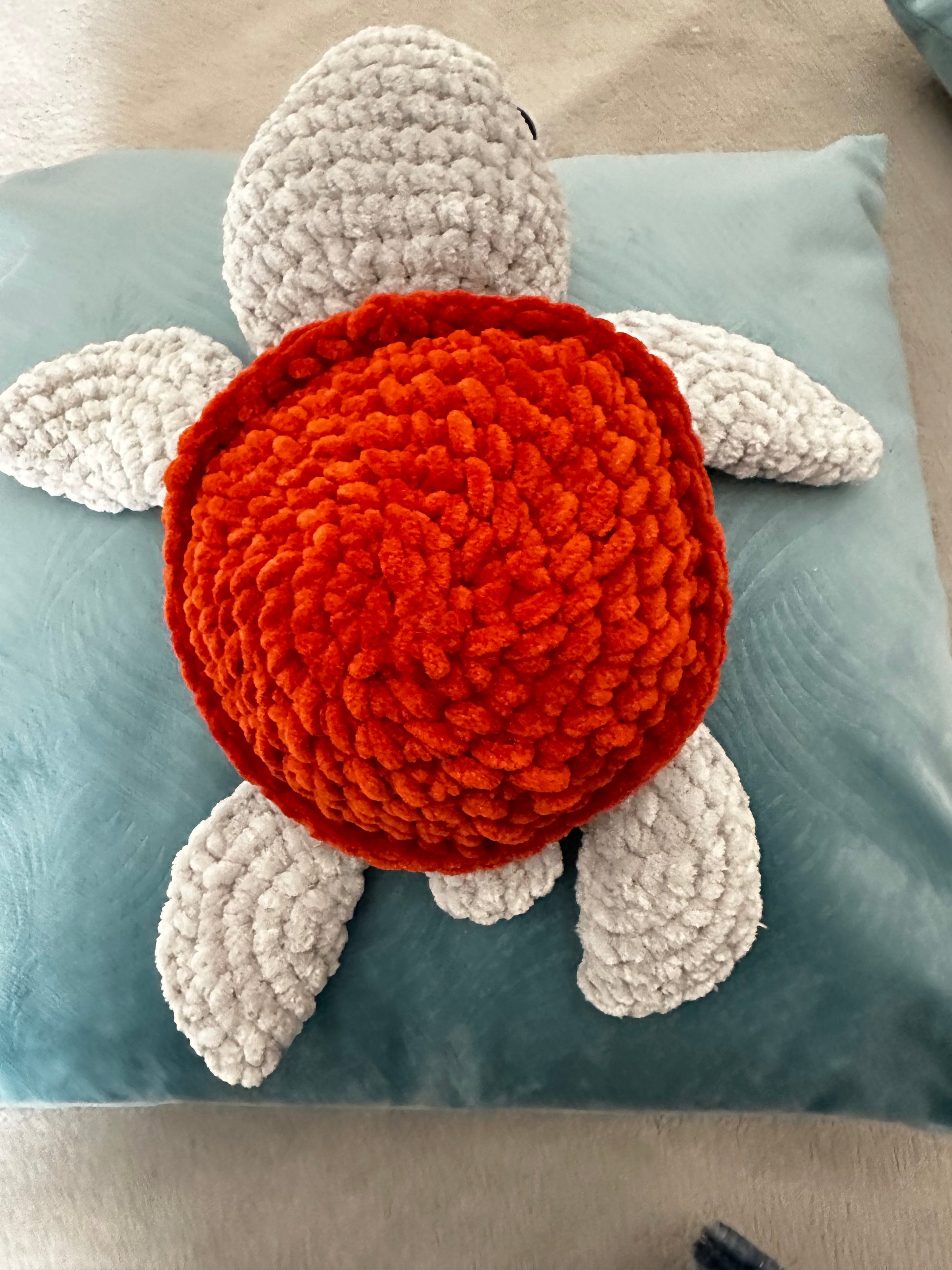 Crochet Pacific Ridley Turtle. A Plushie made with Chenille wool, the stuffing is recycled. An ideal gift or even for decoration. A cute addition to any household aswell as being very cuddly. A velvet feeling Yarn. Also underneath on the tummy Pacific Ridley has an extra burst of colour