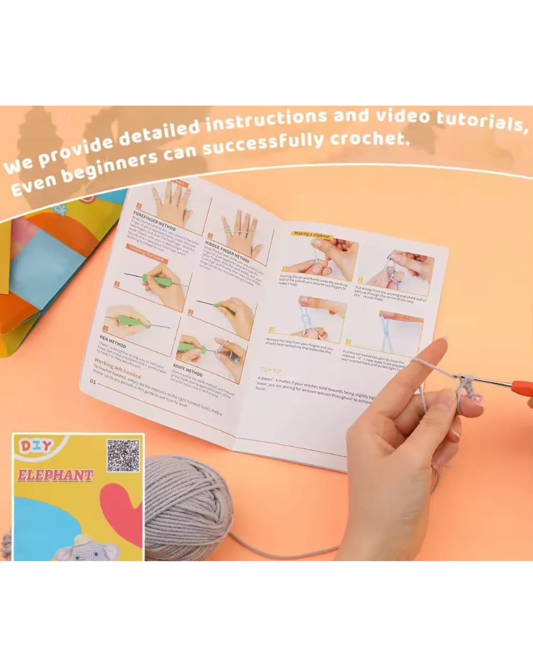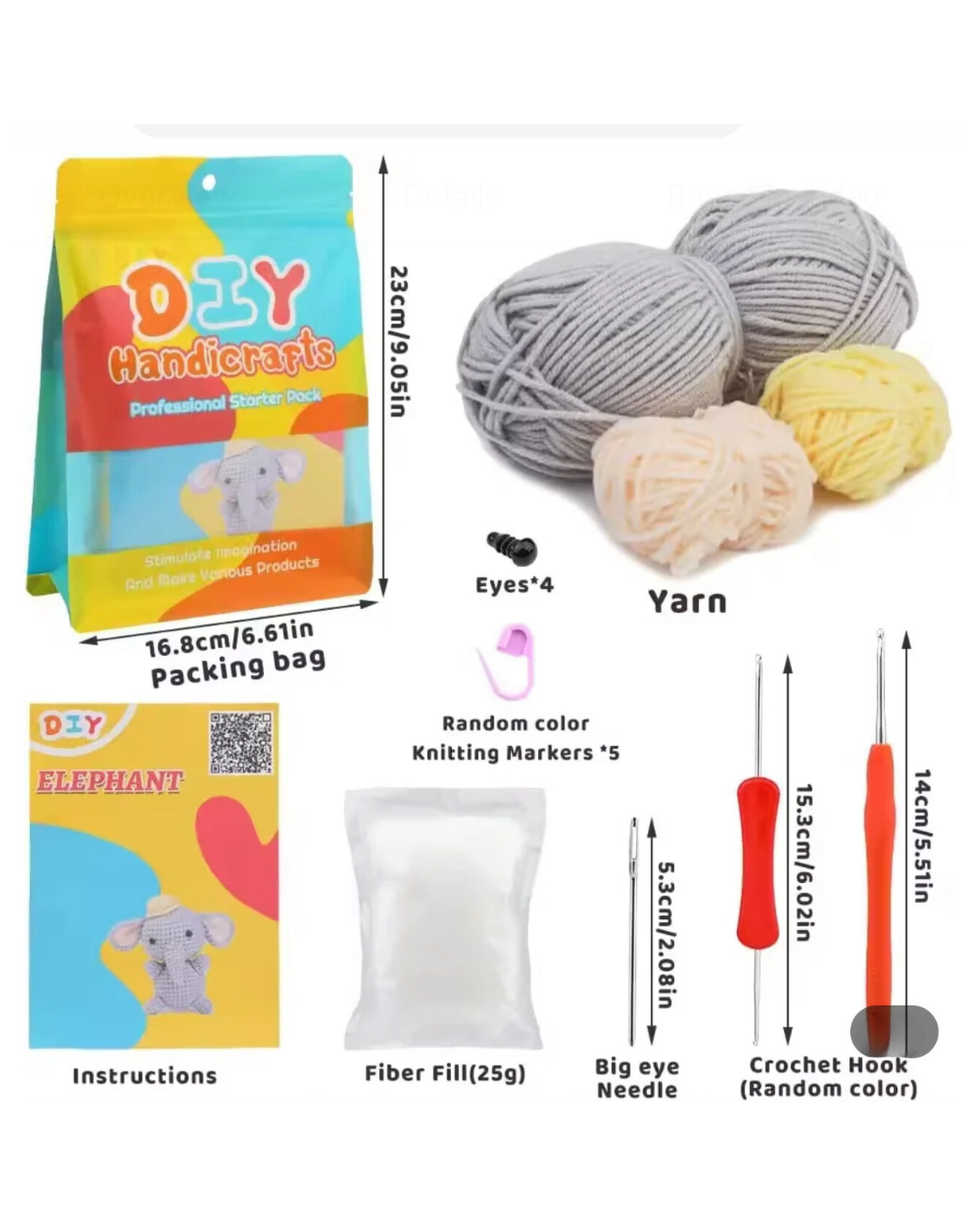 Beginner Crochet Kit. Comes with cotton yarn, crochet hooks, needles, stitch markers, safety eyes and stuffing. Also included are step by step instructions swell as a video to follow.