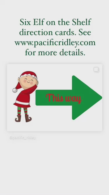 Six Elf on the Shelf direction cards. Can be printed on plain 230gsm A6 cards or A6 seeded card that they can plant afterwards. There are 2 Right, 2 Left and 1 Up, 1 Down. All featuring a cheeky Elf on.