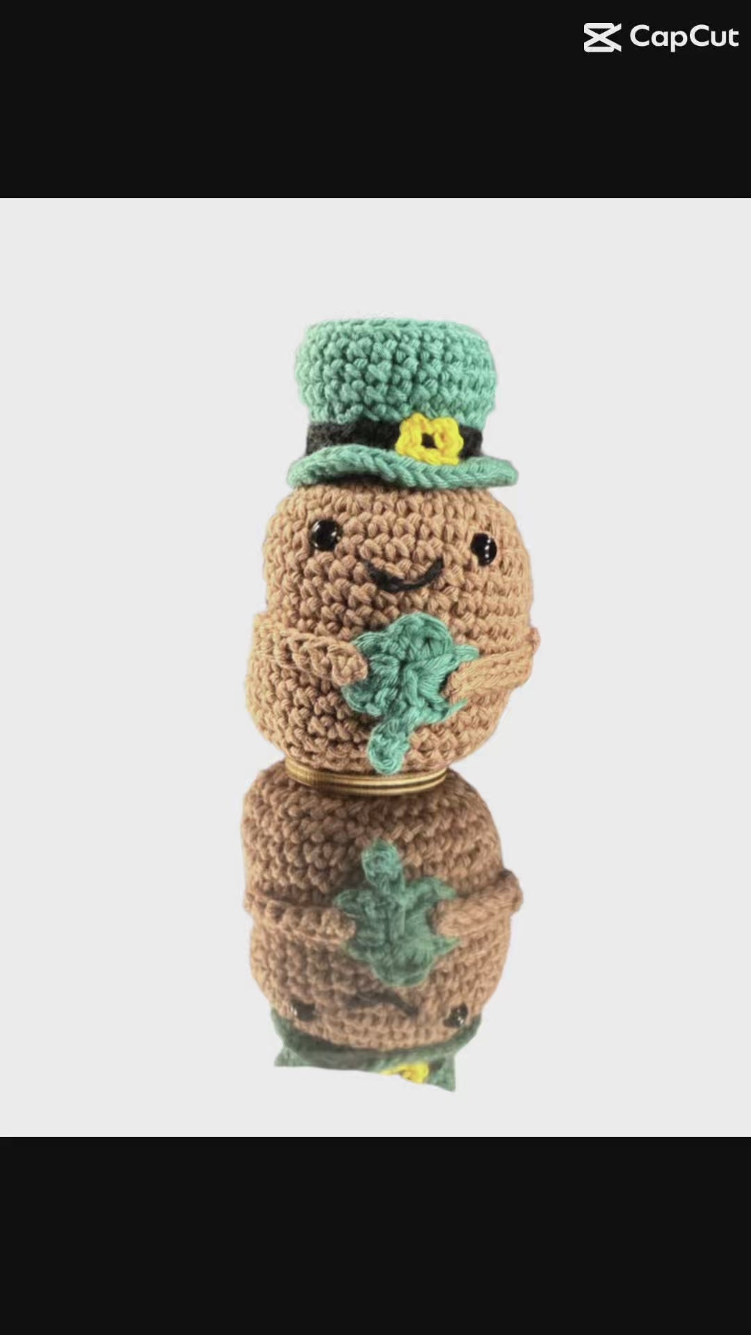 This adorable potato is 10 cm tall, 19 cm in circumference, and 9 cm wide, lovingly crocheted from soft cotton yarn. It wears a classic green leprechaun hat, complete with a hidden 5p piece tucked inside for an extra touch of Irish luck. In one little yarn arm, it proudly holds a shamrock, a symbol of good fortune and national pride.